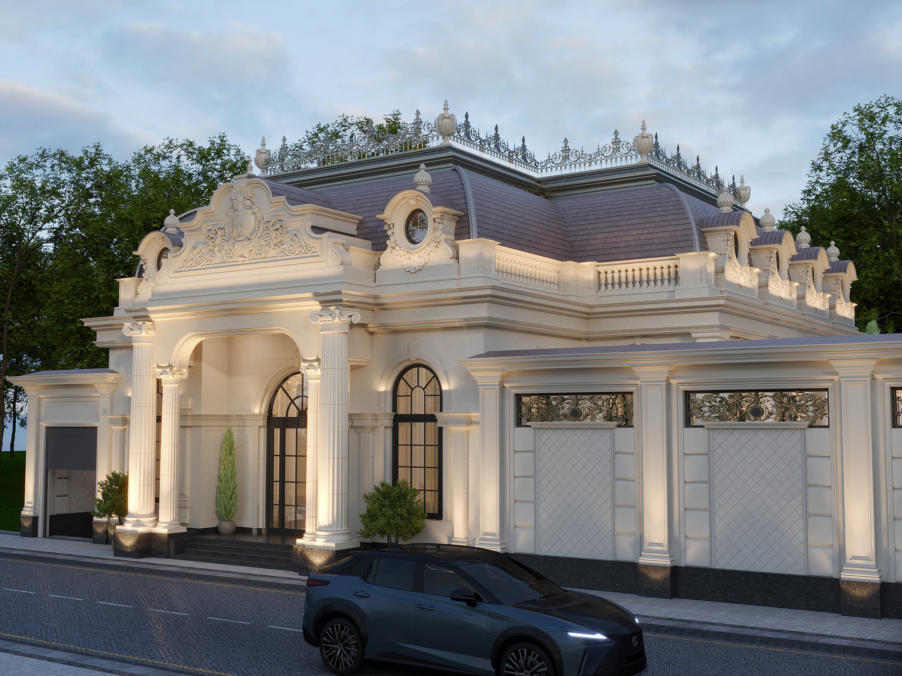 Фасад выполнен в светло-бежевых и молочных тонах с мягкой тёплой подсветкой, подчёркивающей пластичность архитектурных форм. Крыша — тёмно-серая, шиферная или стилизованная под натуральный камень.