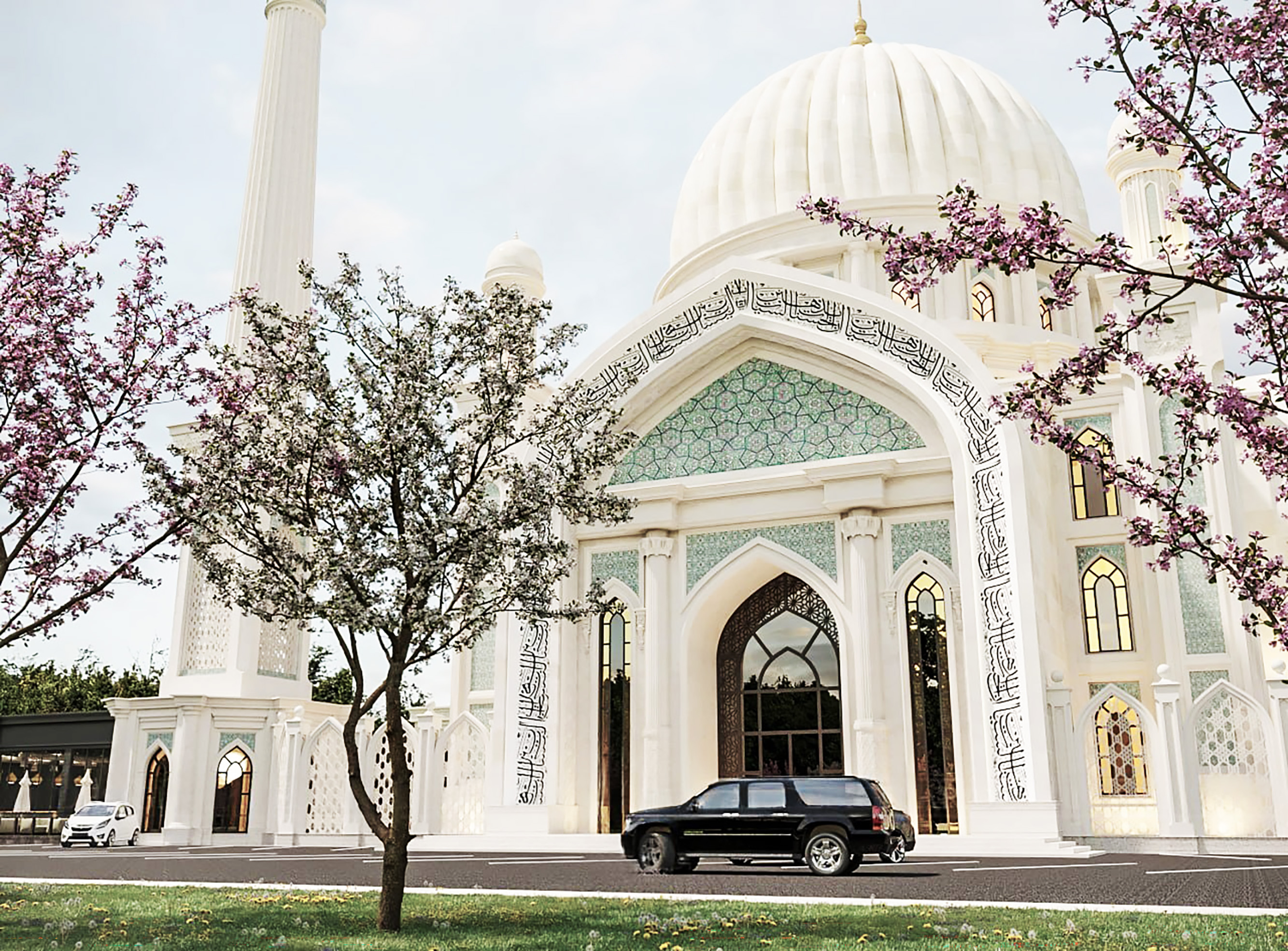 Центральный элемент композиции — величественный белоснежный купол, олицетворяющий чистоту, духовность и единство. Он увенчан золотым шпилем и окружён четырьмя изящными минаретами, которые придают зданию вертикальную выразительность и подчеркивают его сакральность.