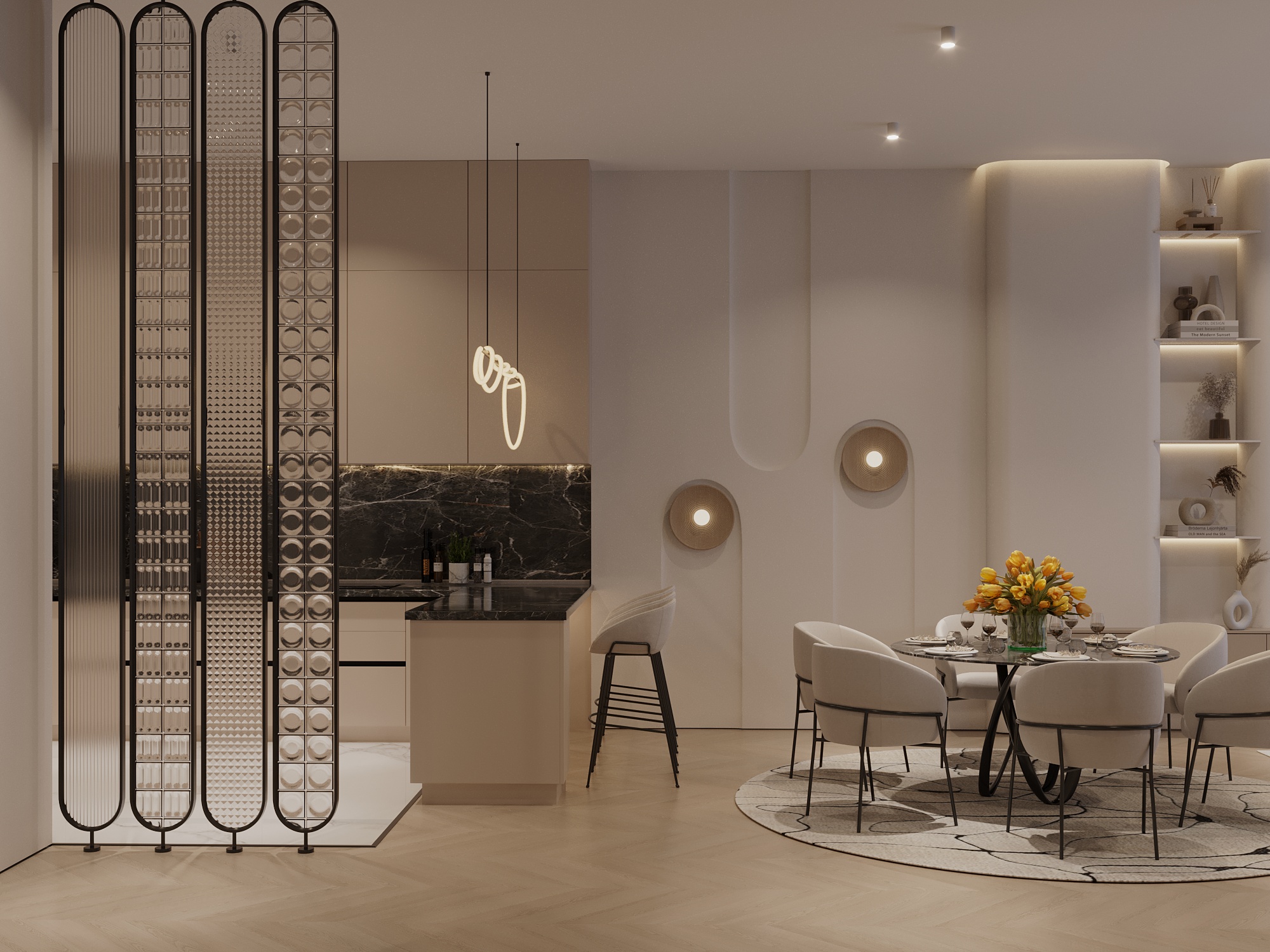 Интерьер сочетает минимализм, современную классику и арт-деко. Основная идея – создать светлое, изящное пространство с ощущением гармонии и лёгкости, где каждая деталь (от перегородки до светильника) выступает как декоративный элемент.