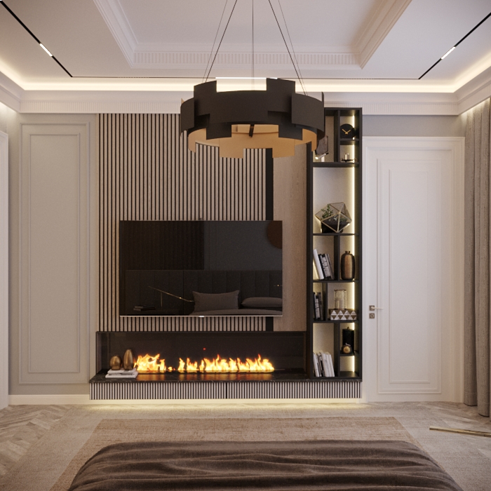 Общий эффект — гармоничное сочетание современности и классической элегантности, создающее уютную и стильную атмосферу в спальне.