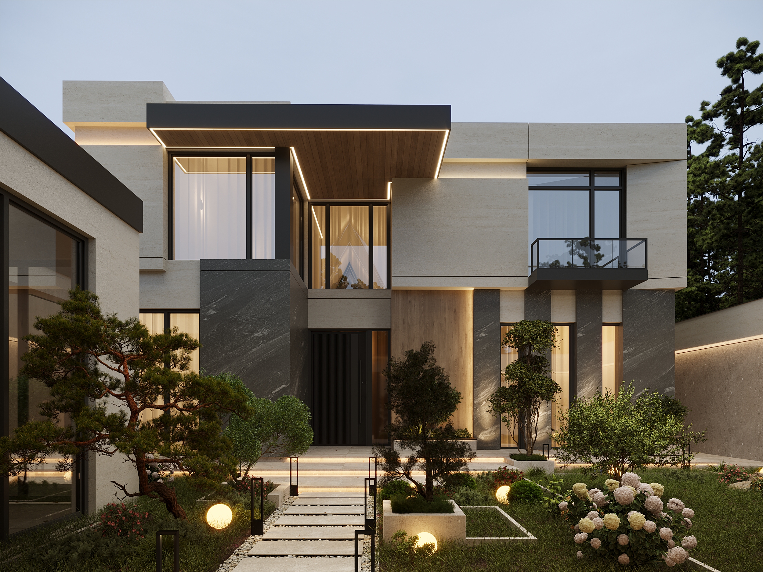 - Материалы: фасад выполнен из комбинации стекла, бетона, искусственного камня или керамогранита. Используются панорамные окна с металлическими рамами, светлые и темные поверхности создают эффект игры текстур и цветов.