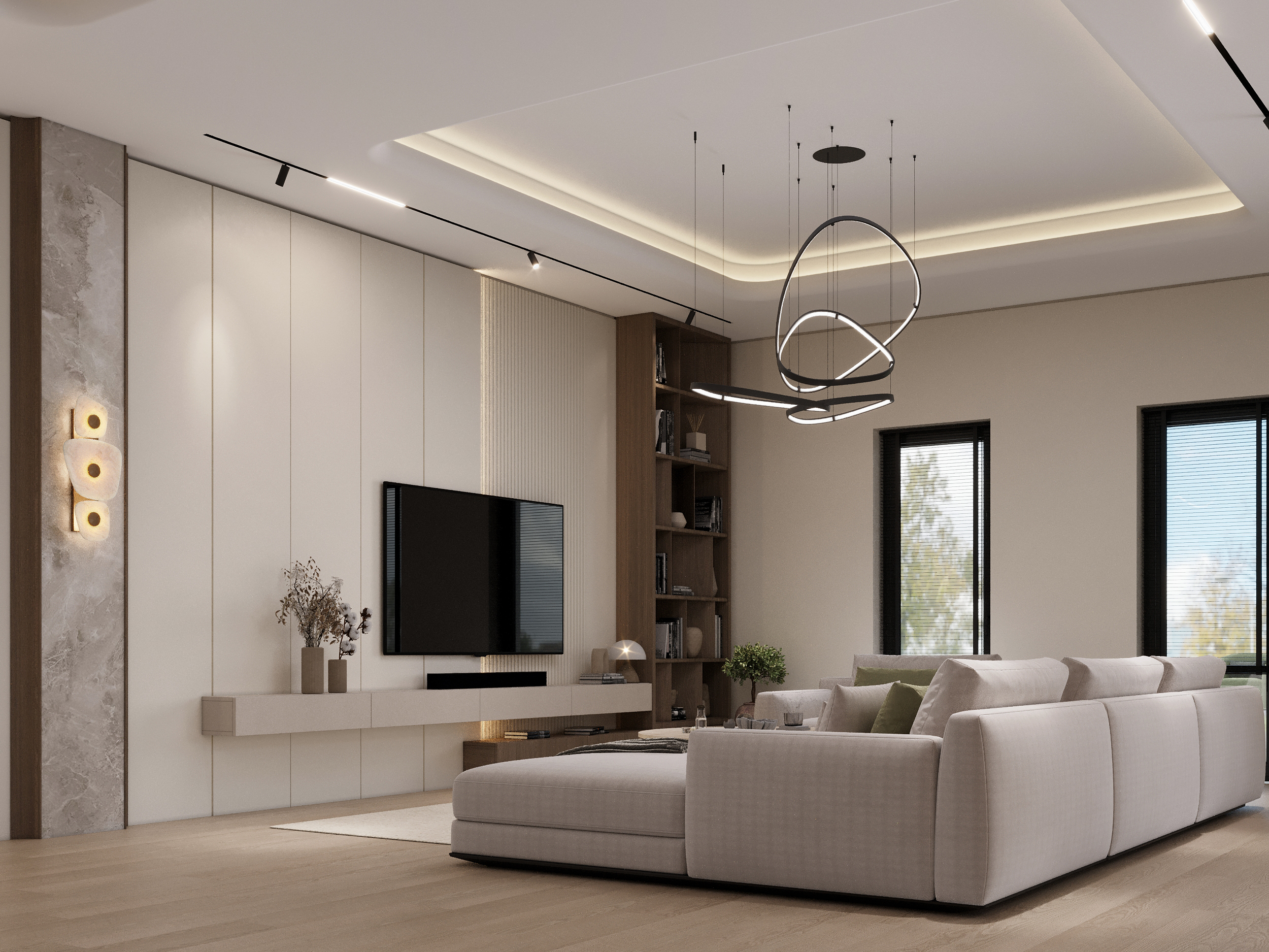 Освещение: мягкое, теплое, встроенное освещение подчеркивает структуру и создает уютную атмосферу.
