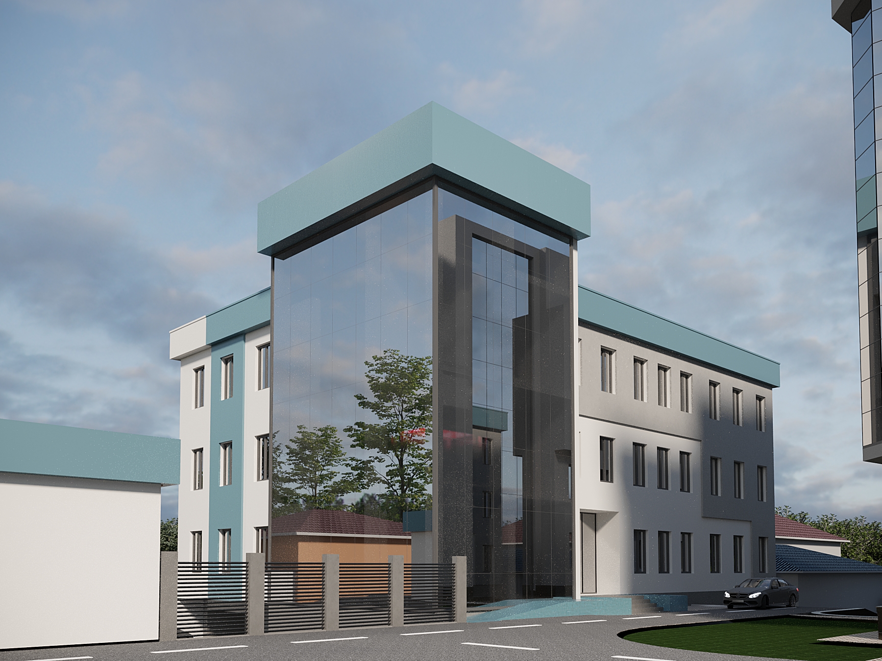 Здание задуманное как центр медицинской или клинической деятельности, ориентированный на комфорт и современное обслуживание. Наличие больших окон и открытых террас создает ощущение открытости и доверия. Территория вокруг здания аккуратно ухожена, с зеленью, кустарниками и тротуарами, что подчеркивает заботу о клиентах и сотрудниках.